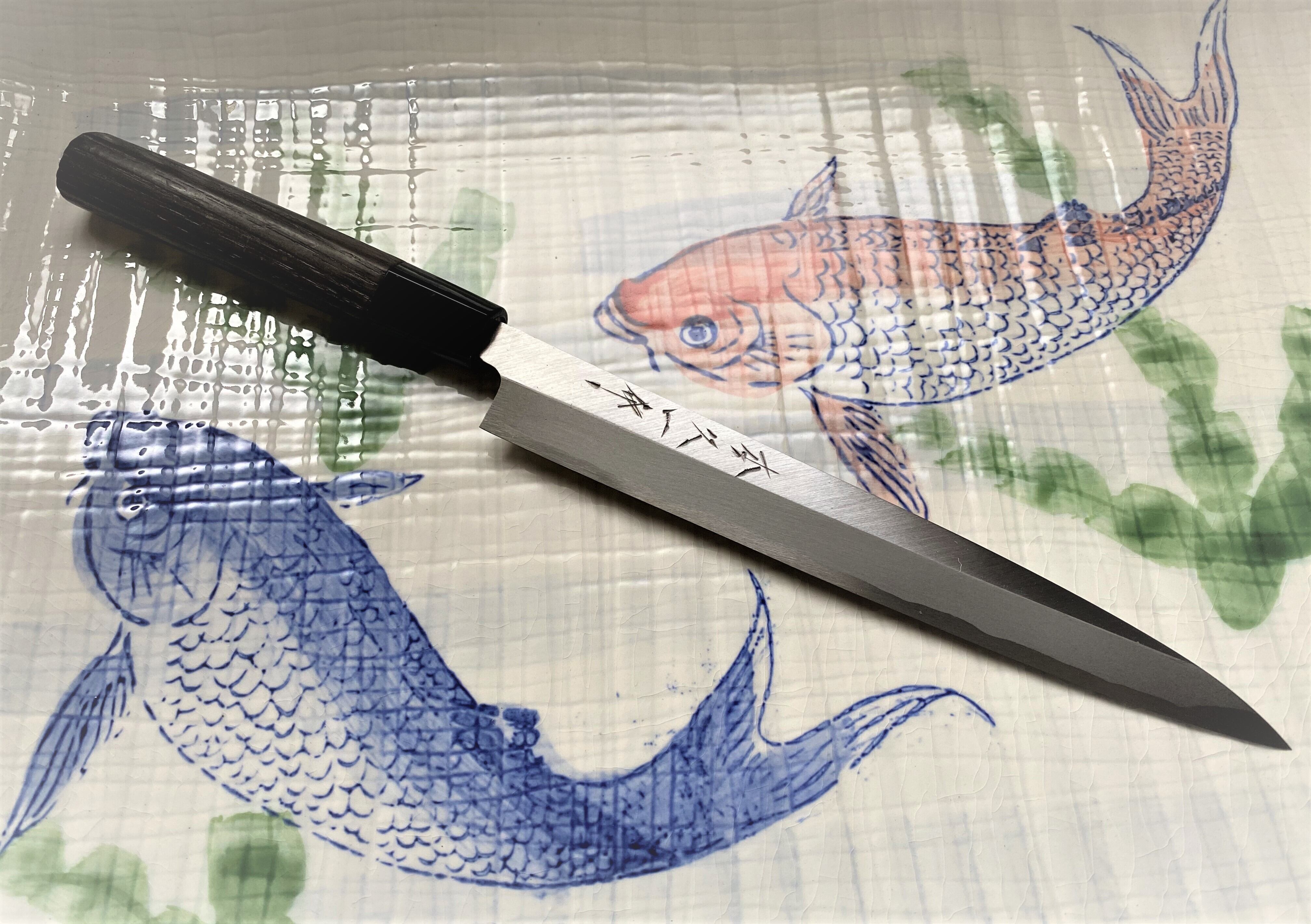 安来青紙鋼使用で製鍛造した片刃柳刃(正夫)包丁です。安来青紙鋼ならではの切れ味です。