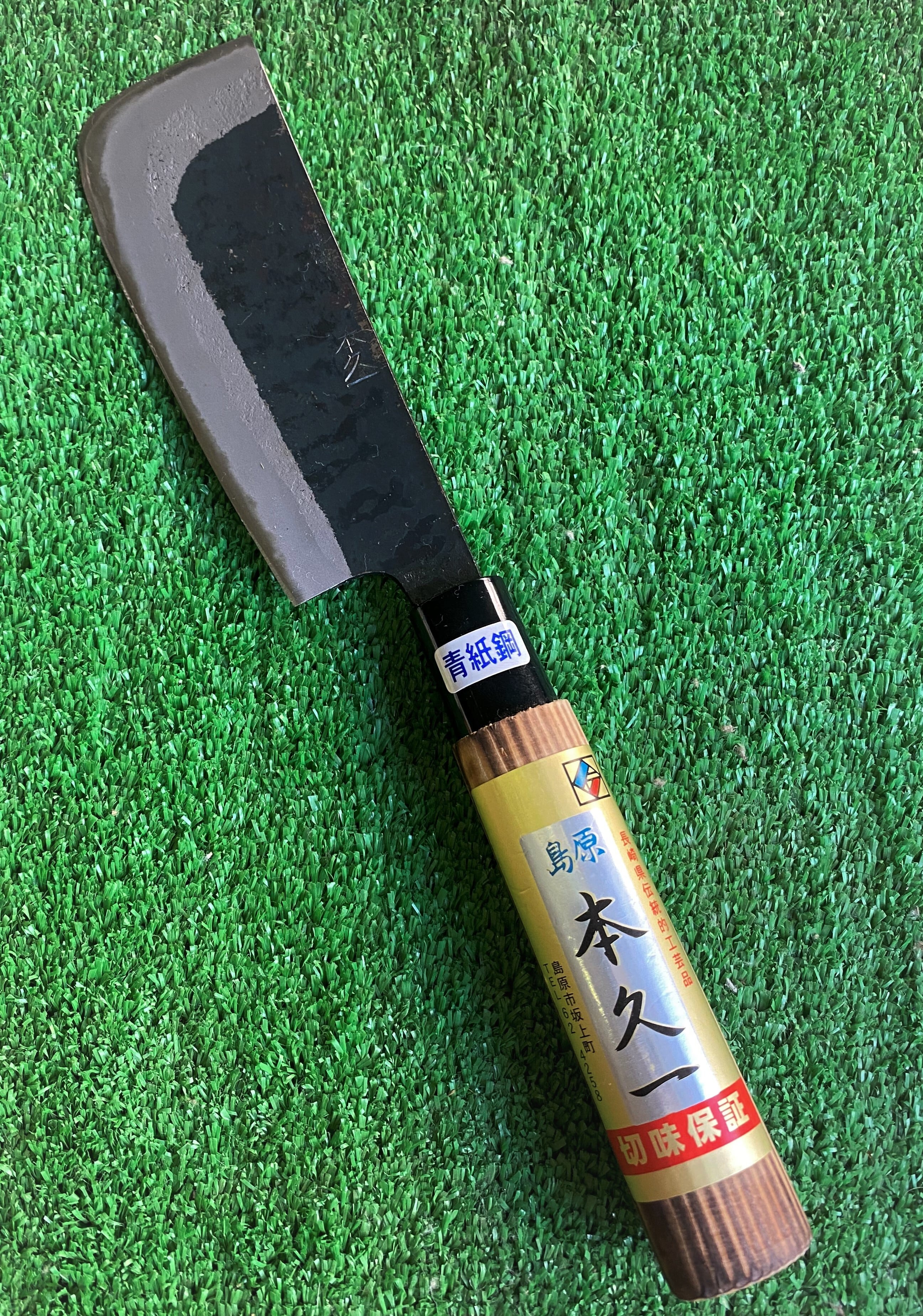 畑で野菜の収穫時に使用される包丁なので、どうしても泥を一緒に切ってしまいます。泥を切ると刃のつぶれが早いので、当店の野菜収穫包丁は、使用鋼に安来青紙鋼を用いて製鍛造しています。青紙鋼ならではの鋼の強さ、切れの持続がありますので、農作業の作業効率アップに繋がればと思っています。また、柄木に焼松の柄を使用していますので、強く長持ちいたします。重量も約130g程度なので軽く、農作業の負担軽減にもなればとの想いを込め製鍛造しています。