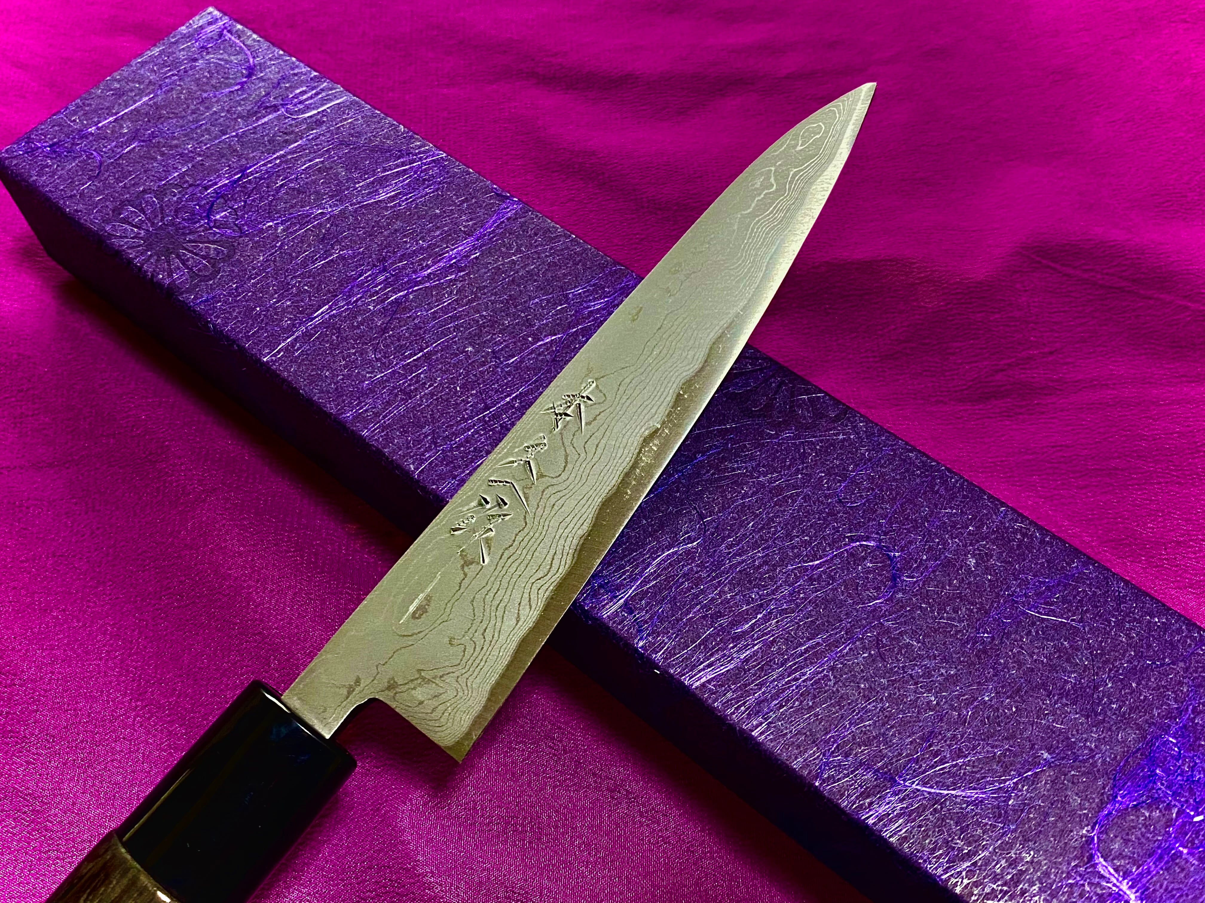 製鍛造に安来青紙鋼を使用した積層墨流しの和ペティ包丁です。人気の和ペティ包丁の135㎜タイプです。ペティタイプなので細身で軽く、小回りが利き、キャンプや釣り(その場での魚締めや刺身引きに)などにもよくご使用になられています。もちろんご家庭での、肉切り・野菜のきざみにも適した包丁です。